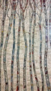 I suoi tronchi, allineati, rossi, verdi, blu, violenti e innaturali nei colori, funzionano come una partitura: una musica visiva che non accompagna, ma incalza. Sono alberi, sì, ma sono anche sbarre, nervature, cicatrici.